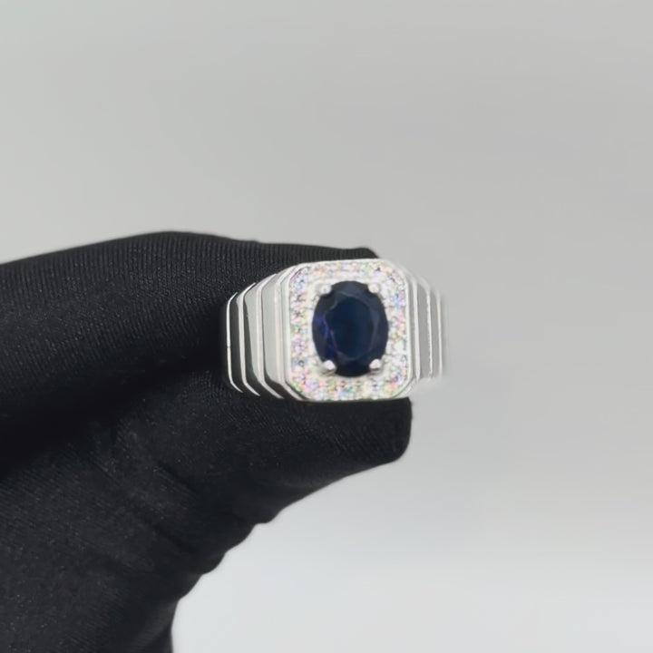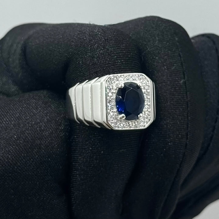 Con piedra tipo zafiro central ovalado rodeado de pavé, elegante y con un aire místico. Una pieza que fusiona lujo y misterio, ideal para quienes proyectan poder interior.