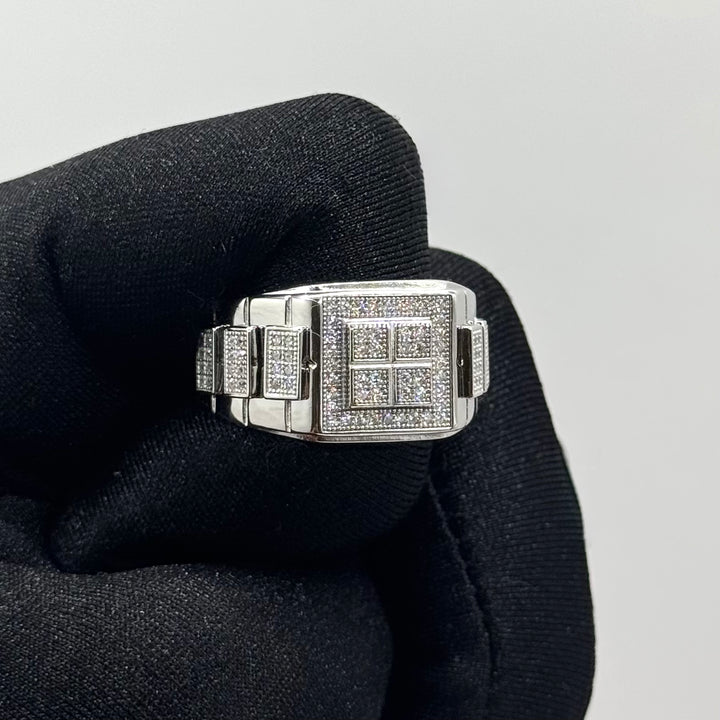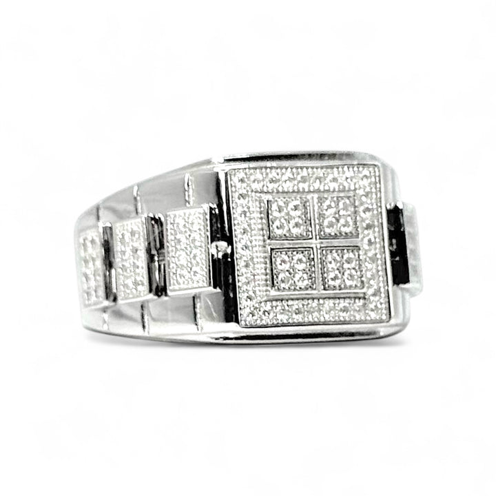 Su diseño cuadrado tipo rejilla lo convierte en un statement piece de lujo callejero. Un anillo que habla de autoridad visual y estilo moderno para quienes marcan tendencia.