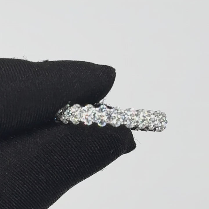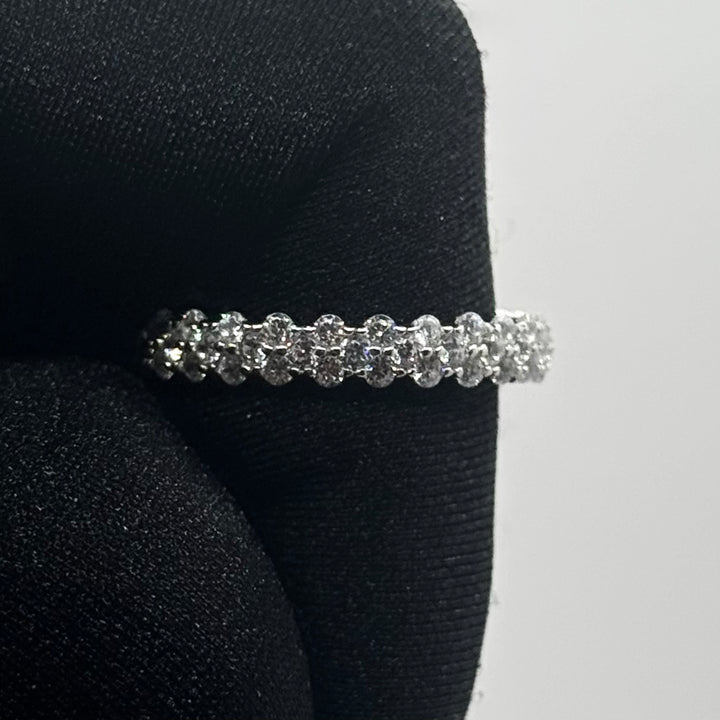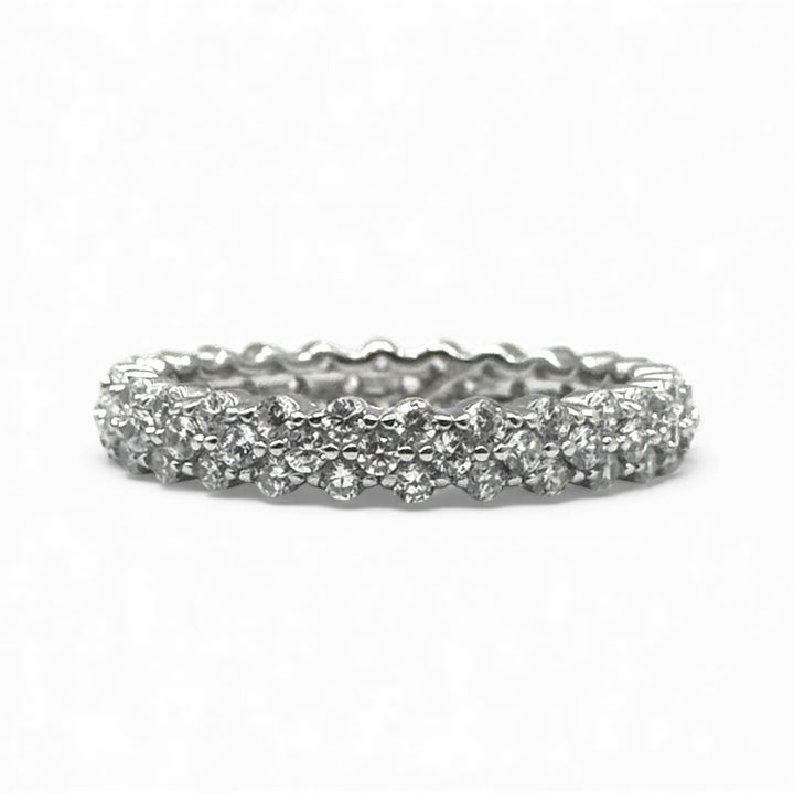 Anillo Eternity Triple Row en plata .925 importada. Banda tipo eternity con tres hileras de circonias al frente. Ideal para quien busca una pieza llamativa con acabado de alto brillo.