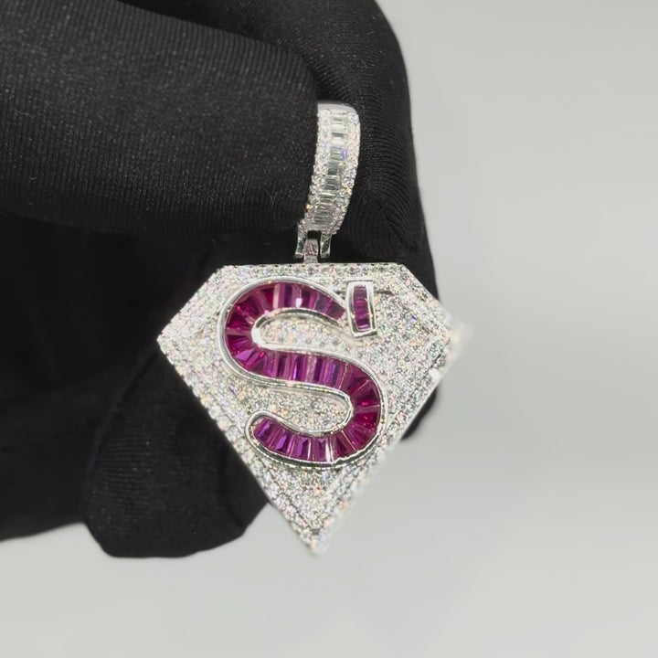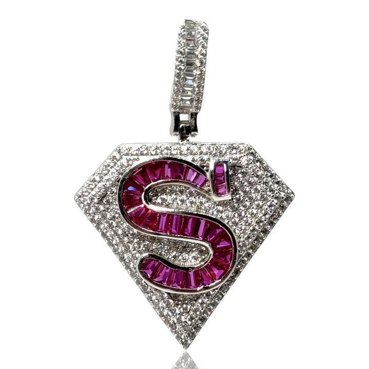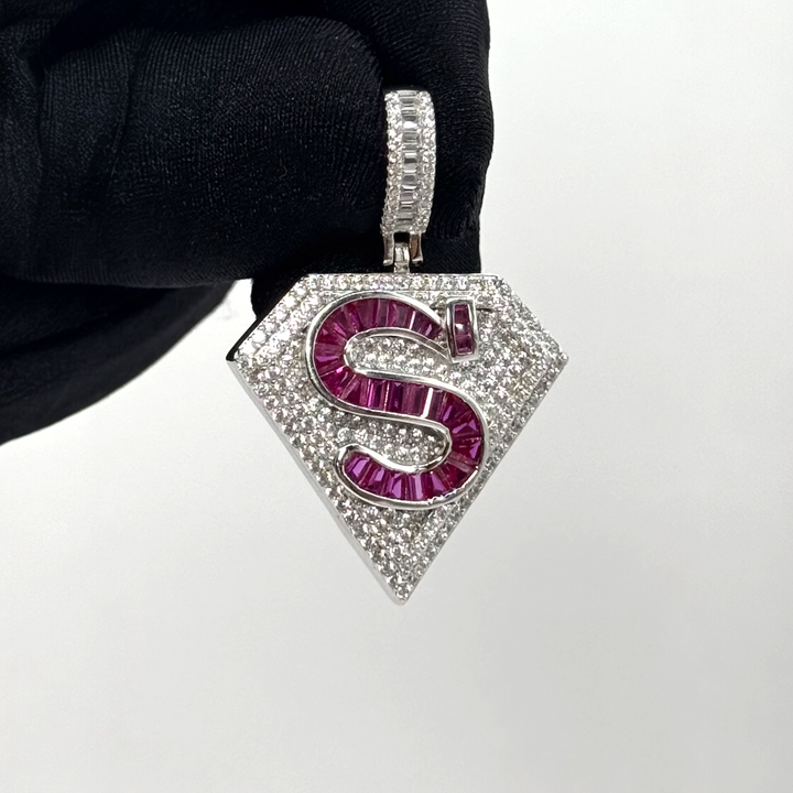 Escudo con inicial ‘S’ adornado con piedras tipo rubí en tono rosado y pavé brillante. Una pieza que transmite carácter y sofisticación, ideal para personalizar tu estilo.