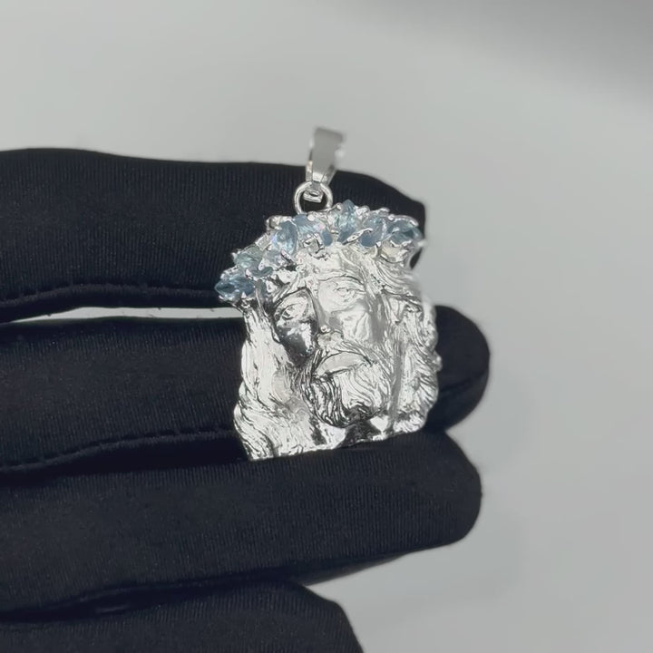 Dije con el Divino Rostro coronado en azul, símbolo de espiritualidad y devoción. Un diseño solemne que transmite fe y elegancia.