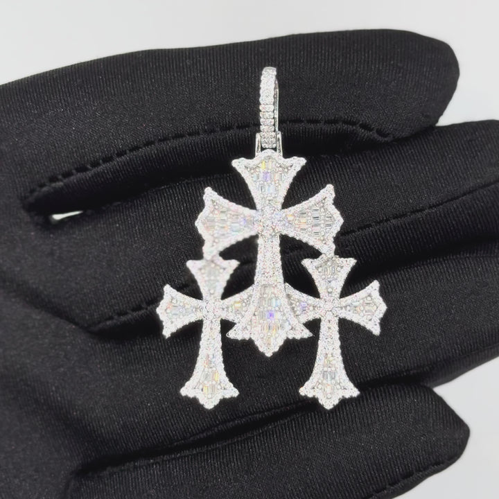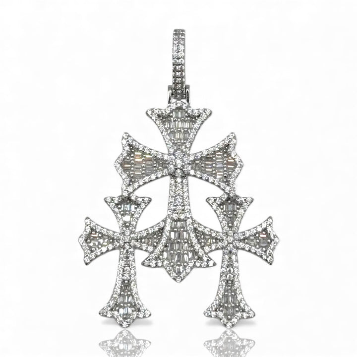 Cruz Gótica Triple Ice en plata .925 importada. Cruz gótica con triple nivel de circonias, brazos estilizados y silueta alargada. Ideal para quien busca una pieza llamativa con acabado de alto brillo.