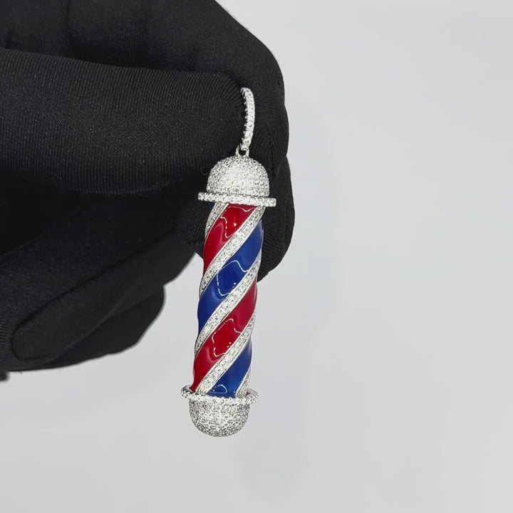 Dije Barber Pole Deluxe en plata .925 importada. Clásico poste de barbero esmaltado con franjas de color y pavé en todo el cuerpo. Ideal para quien busca una pieza llamativa con acabado de alto brillo.