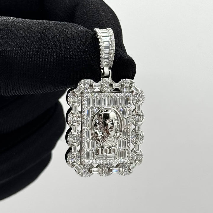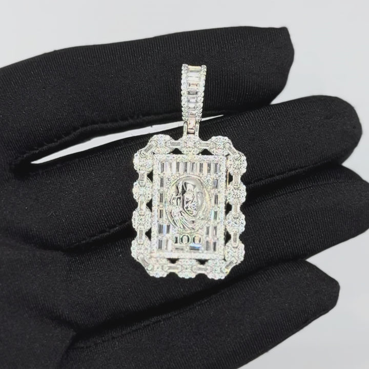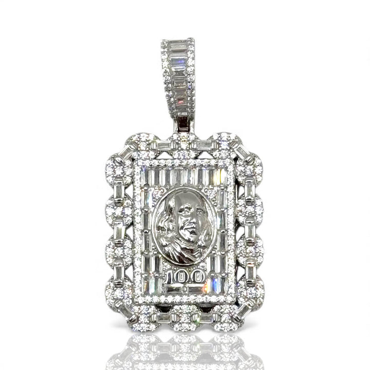 Dije Benjamin Royal Frame en plata .925 importada. Marco rectangular con silueta de billete tipo Benjamin y fondo pavé. Ideal para quien busca una pieza llamativa con acabado de alto brillo.