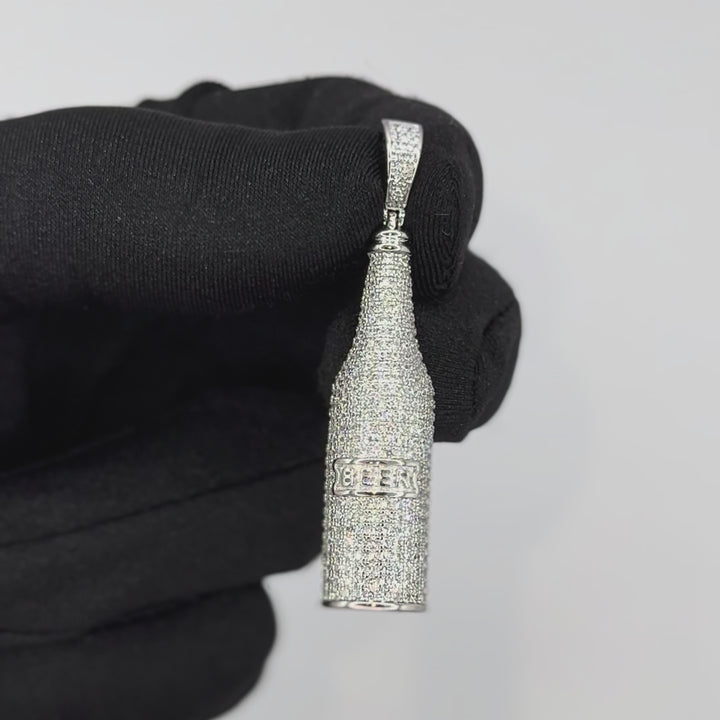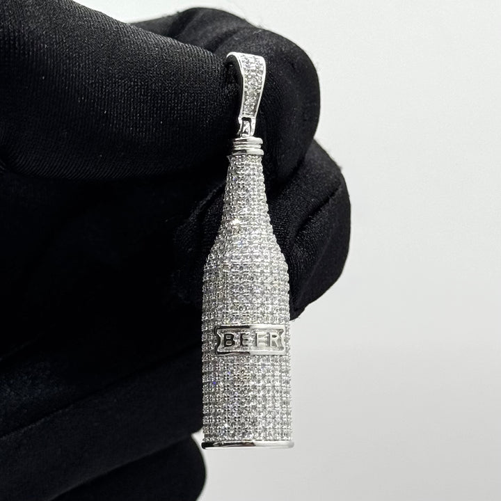 Dije Bottle Ice Beer en plata .925 importada. Botella estilizada con pavé frontal y detalles en el cuello. Ideal para quien busca una pieza llamativa con acabado de alto brillo.