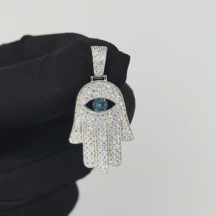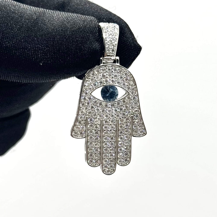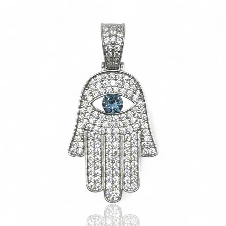 Dije con la Mano de Hamsa y ojo azul central, símbolo universal de protección y buena energía. Su brillo sutil aporta equilibrio y estilo.