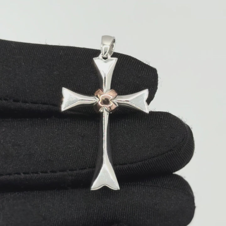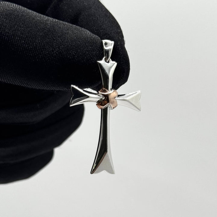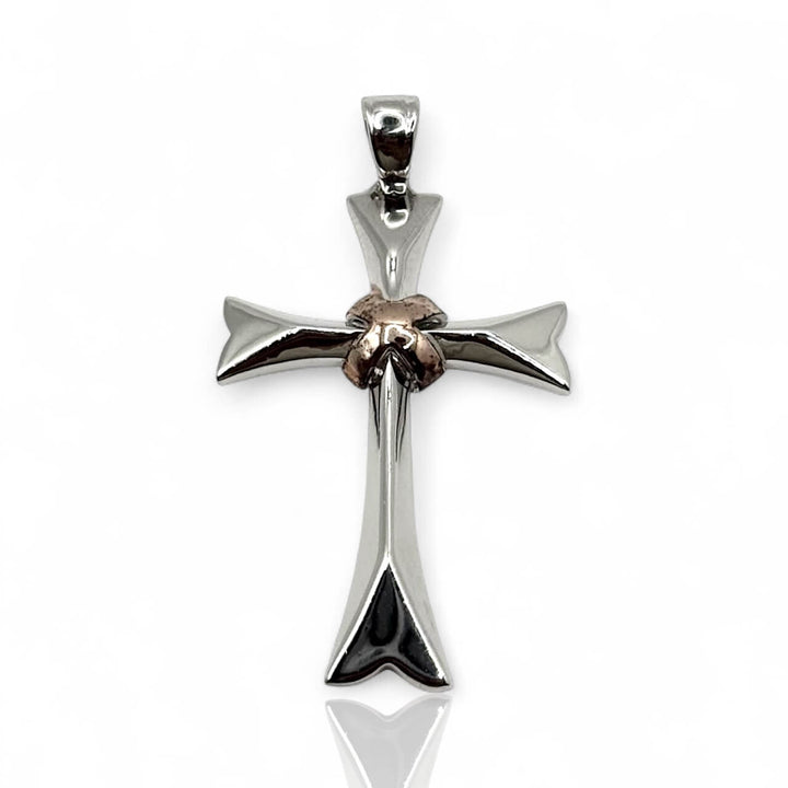 Cruz en dos tonos, con acabado espejo y contorno brillante. Una pieza ligera con presencia que destaca por su armonía visual.
