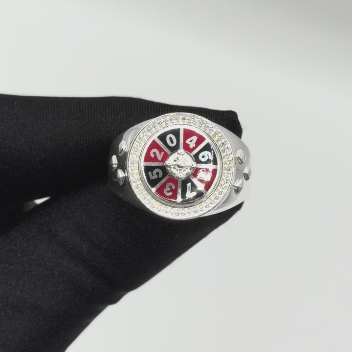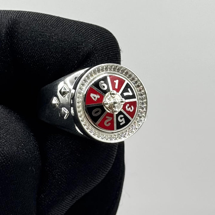 Anillo con diseño inspirado en la ruleta, símbolo de suerte y decisión. Su estructura firme refleja equilibrio entre riesgo y estilo.