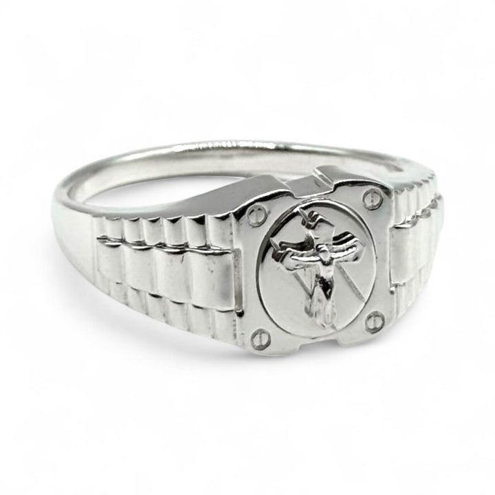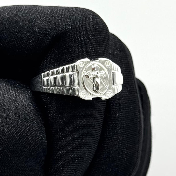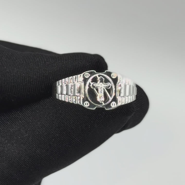 Anillo clásico con cruz central en relieve. Combina simplicidad y elegancia con un toque espiritual atemporal.