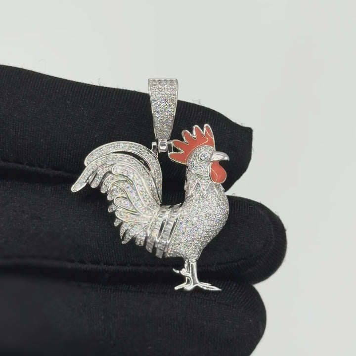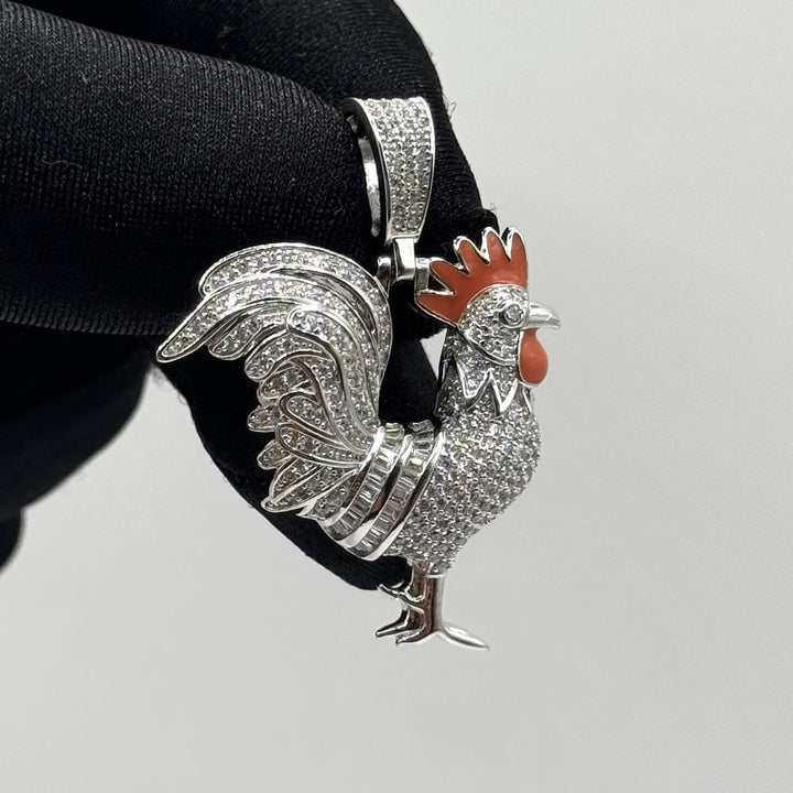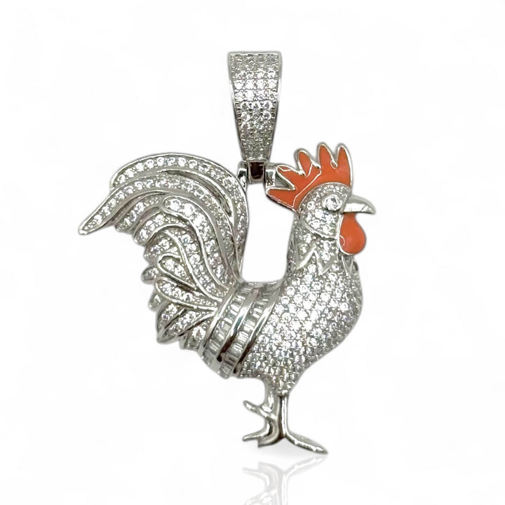 Dije de gallo completamente cubierto de zirconias brillantes. Representa orgullo, determinación y liderazgo con un toque de lujo auténtico.